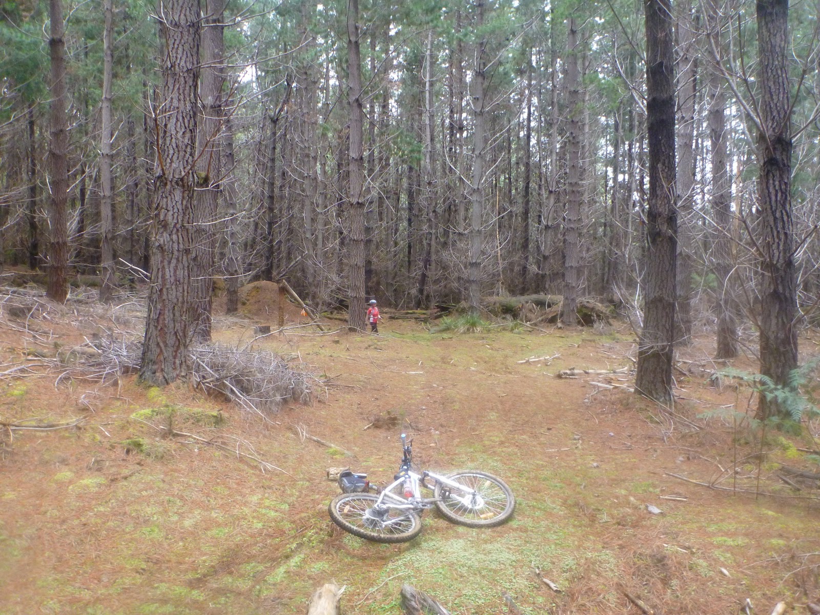 We came up to another pine tree that had fallen across the track, and as I lifted my bike over it the back wheel got caught on a branch and I couldn’t get it unstuck. I think I may have screamed or swore in frustraton before I eventually managed to get my bike over the log. I started climbing over myself, and just as I got half way over the log, I realised I probably had just freaked Kim out, so I turned to explain that I was actually OK. However, just as I did this, I put my weight on a branch which promptly snapped sending me crashing over the log and down into the deep mud on the other side.