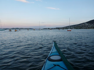 Anyway, we had soon all put in 2 or 3kms at full tilt, when Terry, who was in front of Mike, pulled off to go ashore as he lives in Taroona, and I thought “A ha, here’s my chance to get ahead of Mike” … except when Terry pulled off, he cut me off Wayne’s tail and suddenly I found Mike was the one with a tow up front and I was left by myself having to paddle like mad to get back onto Mike’s tail.