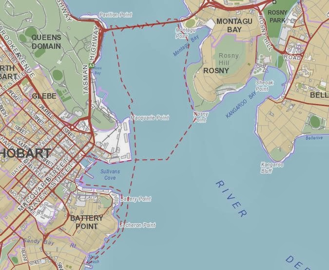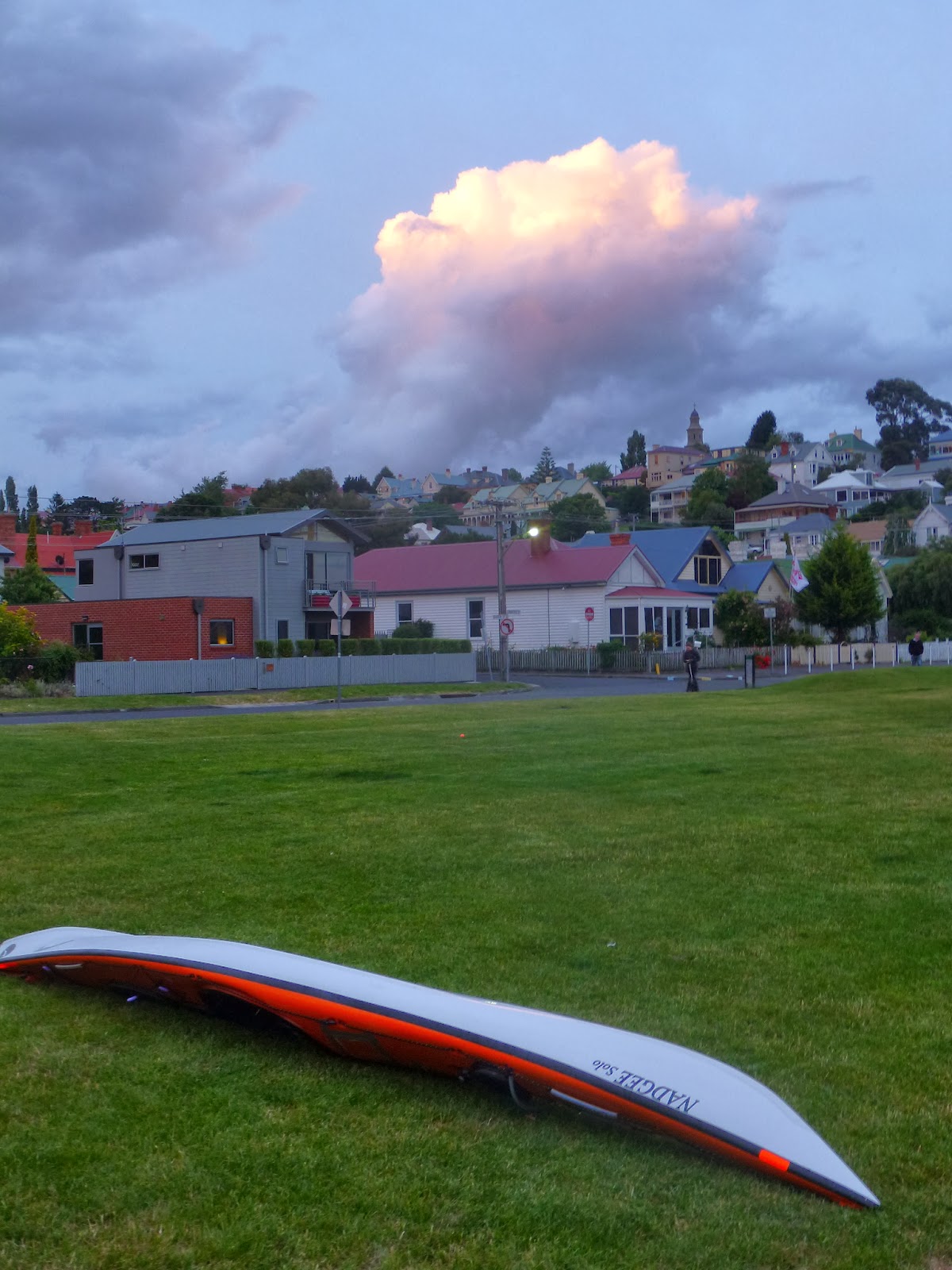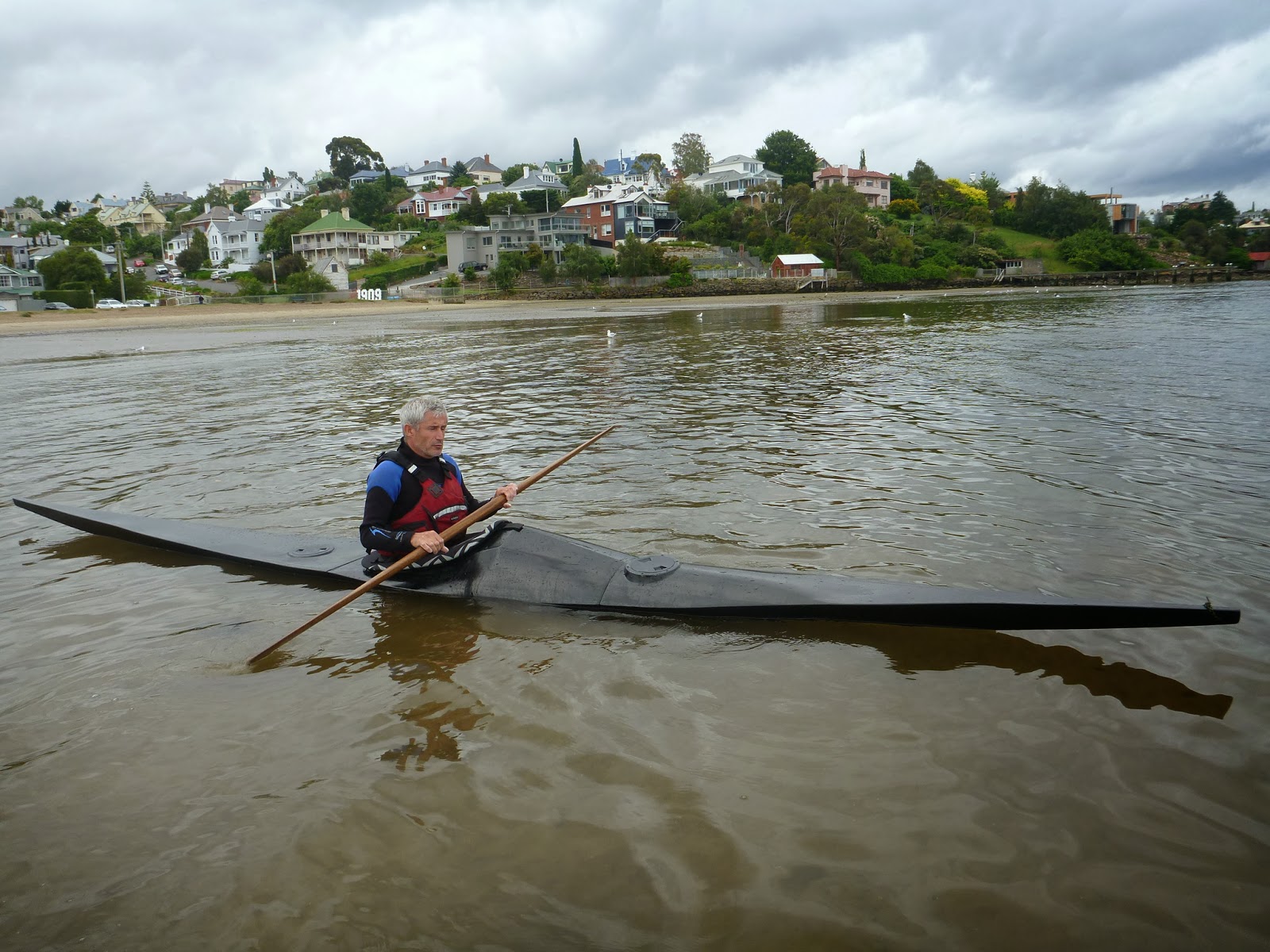 This week we ran into Grant (see pic below) and his hand-built kayak, we got to see the cruise ship departing, we discovered big signs saying that you can’t paddle within 50 metres of the docks when cruise ships are there (they were gone an hour later), we slalomed our way in and out of the bridge as we crossed the river, paddled along the lovely green exposed banks of Rosny at low tide, ducked in between boats, and under buildings at the dock and even tried out the kayak mooring facilities outside Fish Frenzy.
