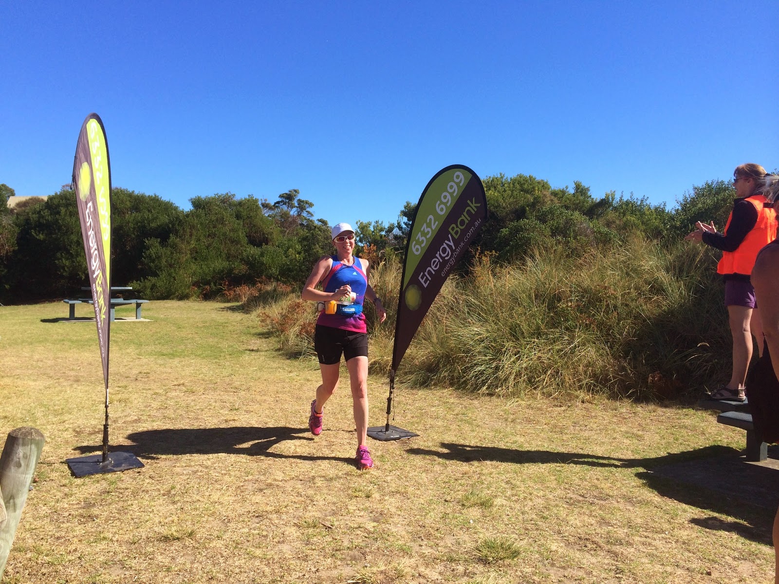 From the end of the beach it was a short rock hop and bike carry up to the road (from where the competitors got to follow a much more scenic route around the foreshore which is off bounds for cyclists) and a quick ride back to Greens Beach where I arrived just in time to get changed, throw the bike in the back of the car and take a photo of Kim as she crossed the finish line …