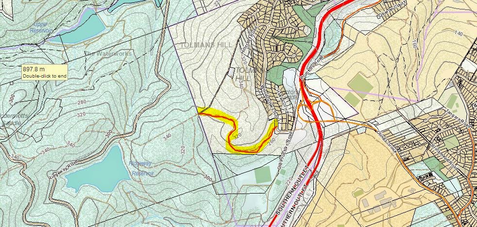 New property highlighted in yellow, currently all bushland, with the trails roughly shown in red |