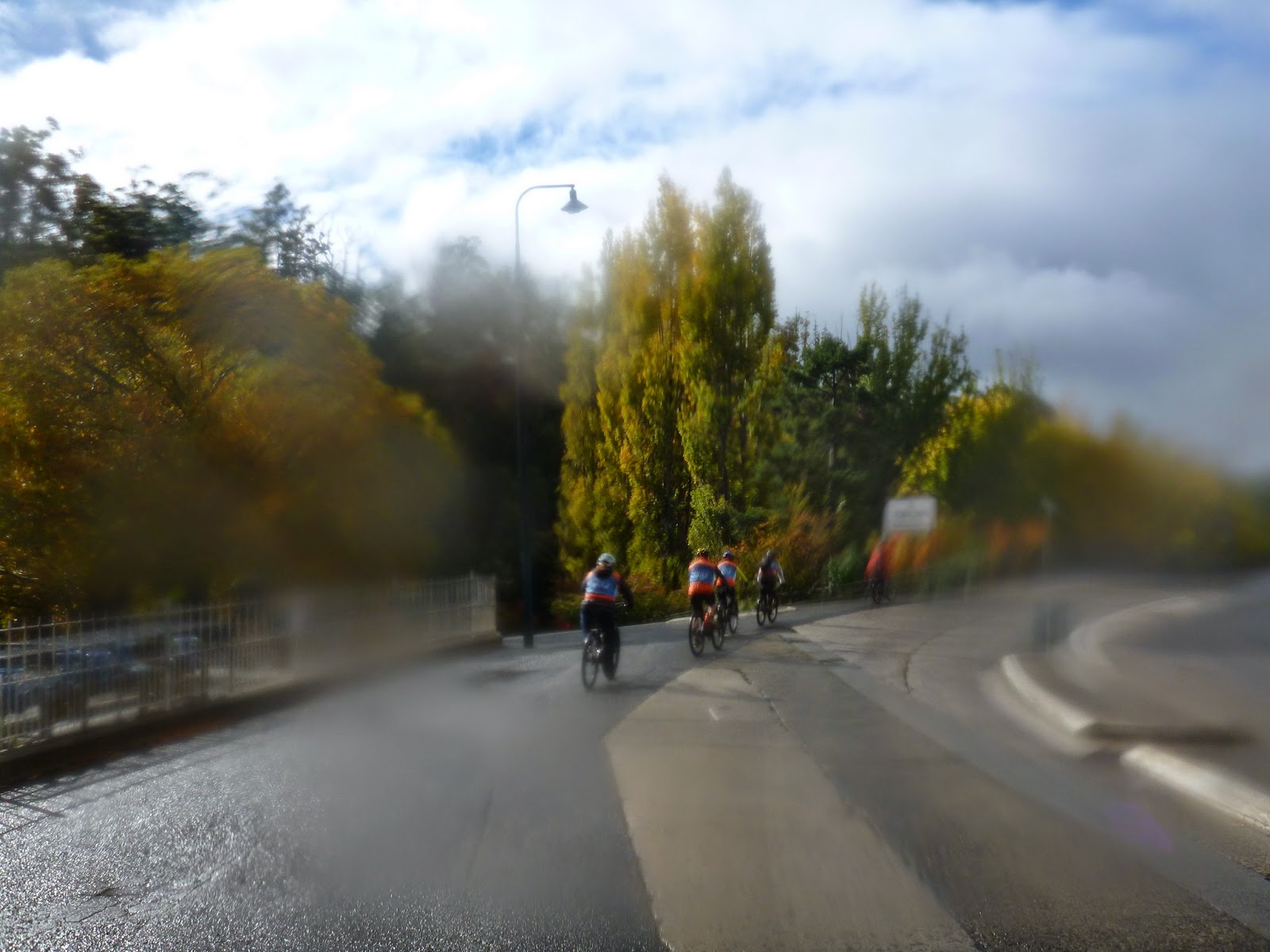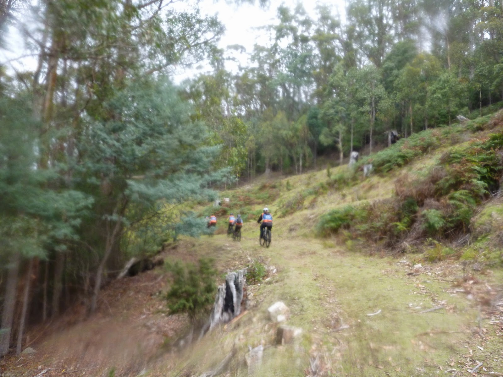 The first section down from the summit to the Springs was Mt Wellington at its best: freezing temperatures, a sideways buffeting wind, ice shards on the road, a heavy mist obscuring any views and a wonderful view of orange riders stretching out in front of me as I mentally fought between wanting to keep my mega warm seal skin gloves on my toasty warm fingers and wanting to rip them off so I could take a photo (one-handed as I rode down an icy, windy, slippery road in the fog) …