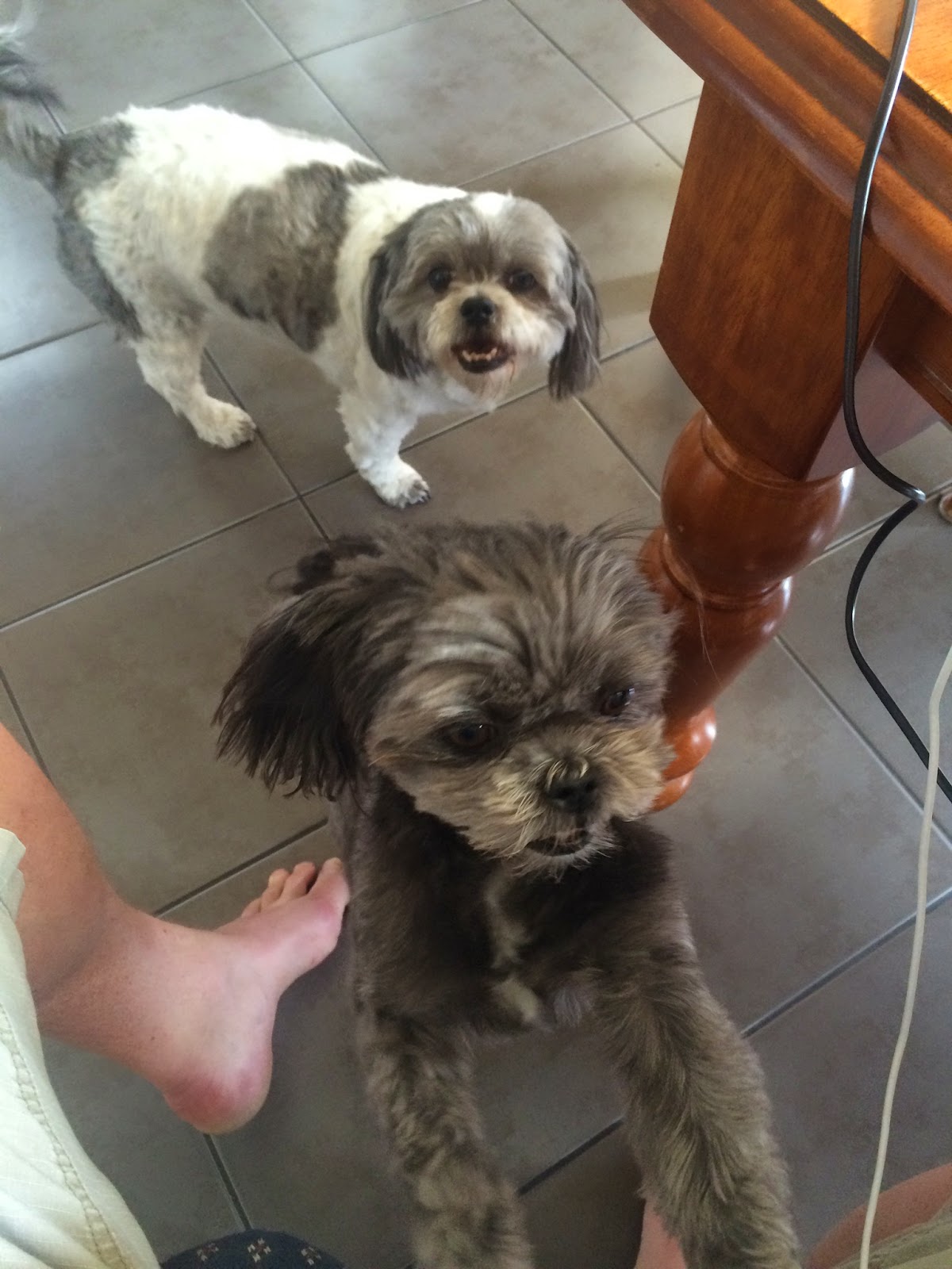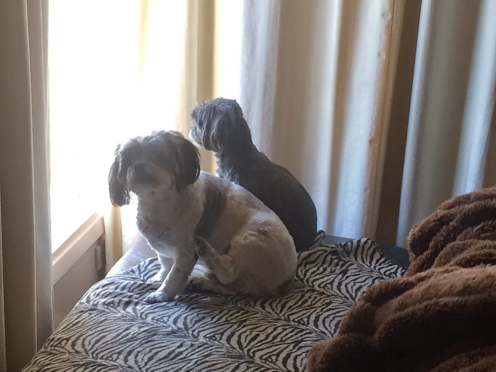 Now overall Ollie and Ella are really taking to the new house, and they particularly seem to like the lounge-room where they can perch themselves up on the couch and dog bed and stare out the window at everything that is going on in their domain …