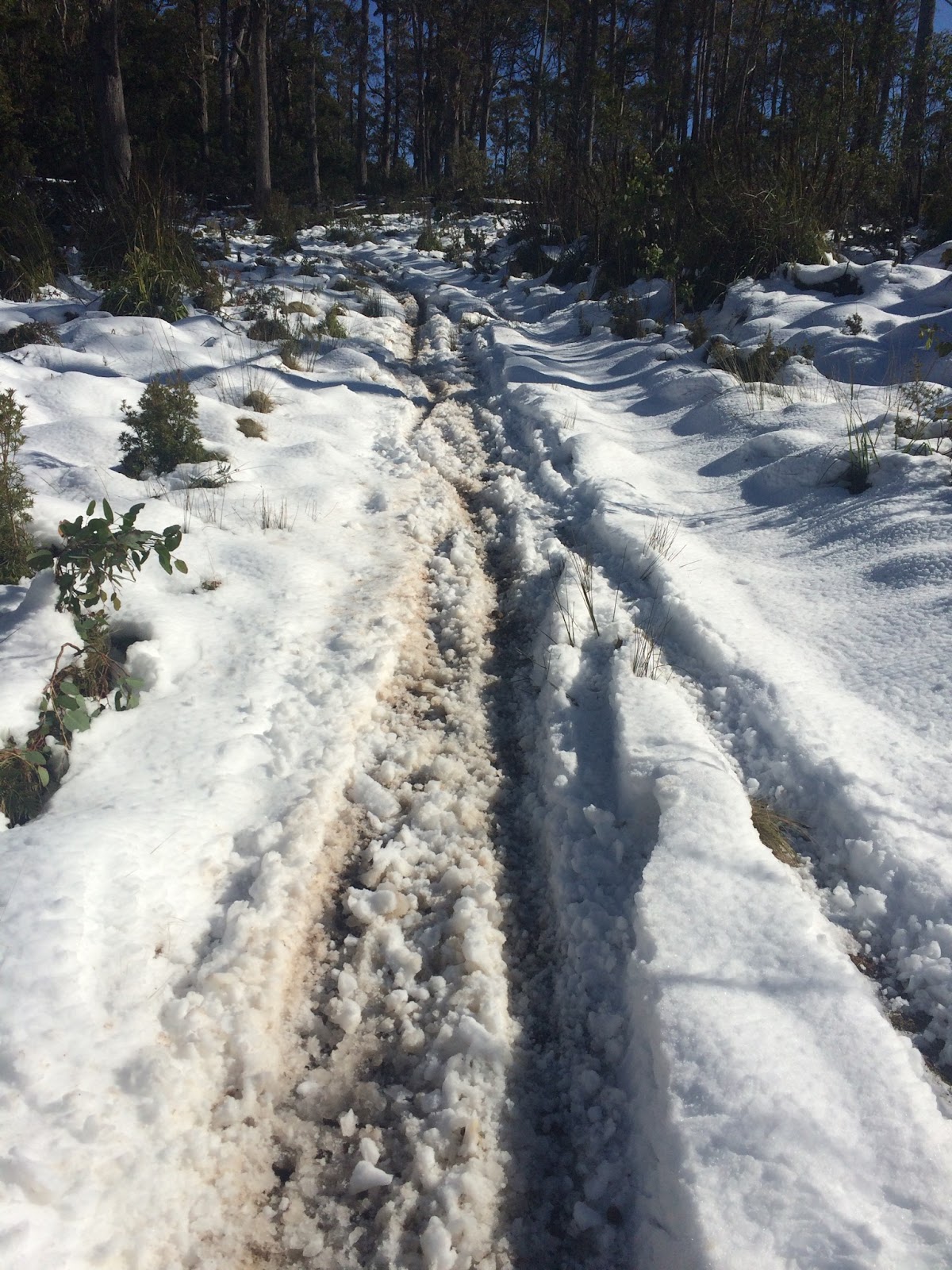 As I got further along the track, the snow got deeper, and then after a steep push up the section of east west track just past the now closed myrtle track, the vehicle tracks stopped and I fund myself in 10-20cm deep virgin snow.
