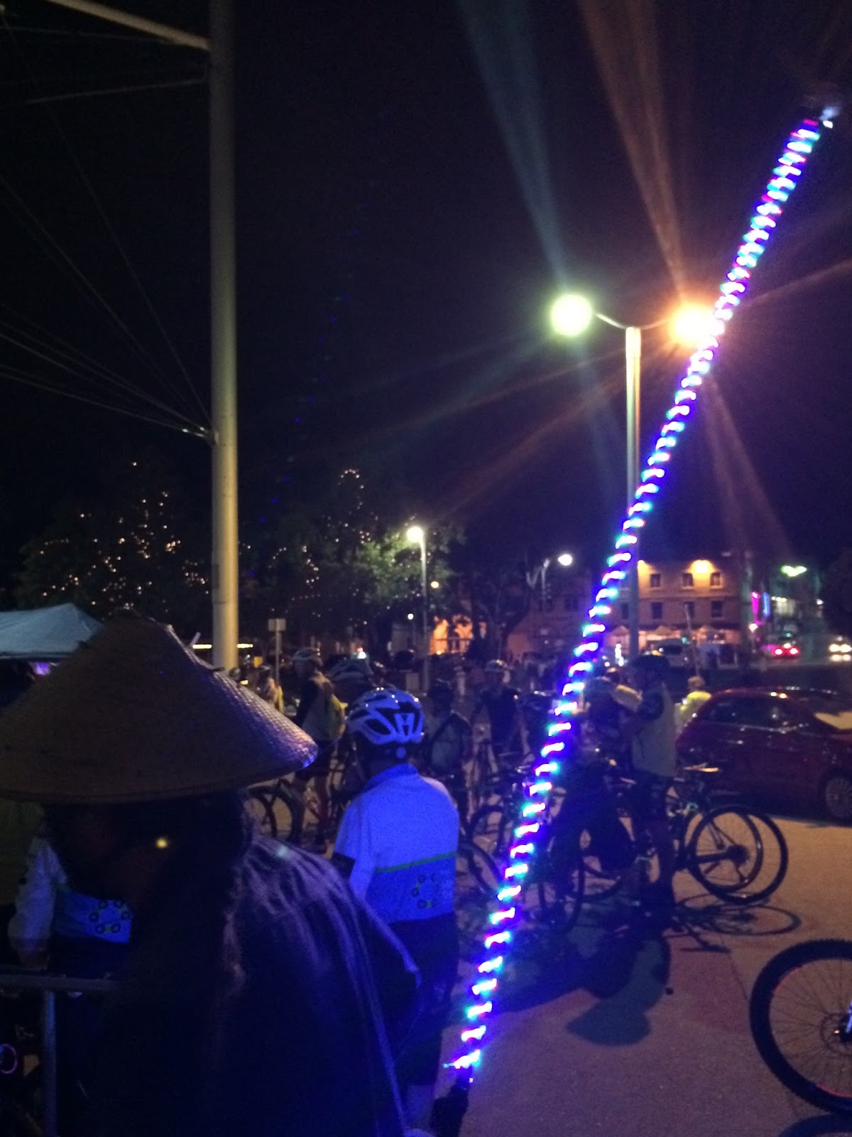 Once at the start I saw quite a few faces I knew, but the main thing that jumped out at me was that this wasn’t the usual event line up of testosterone filled MAMILS on their bikes that cost more than my car.  No, the majority of those present were casually dressed social riders on all sorts of bike configurations and a lot of them had very cool light set ups …