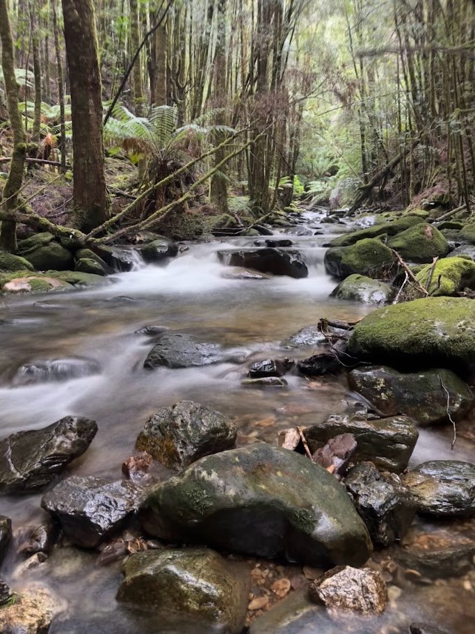 I returned to the track and set off up the correct creek (from the second smaller bridge) and after 50-100 metres found the only viable way forward was to jump into the creek and start walking up that.