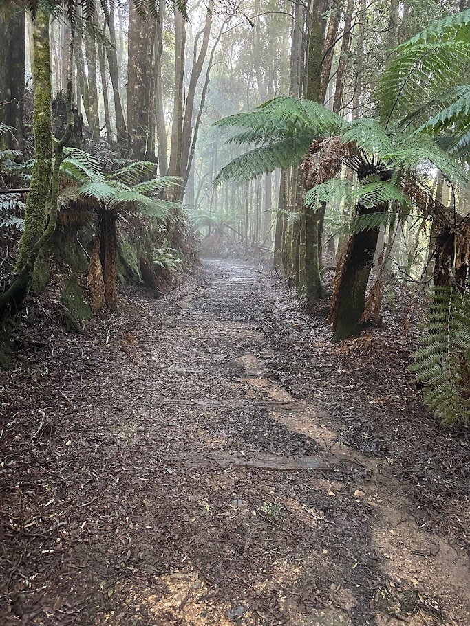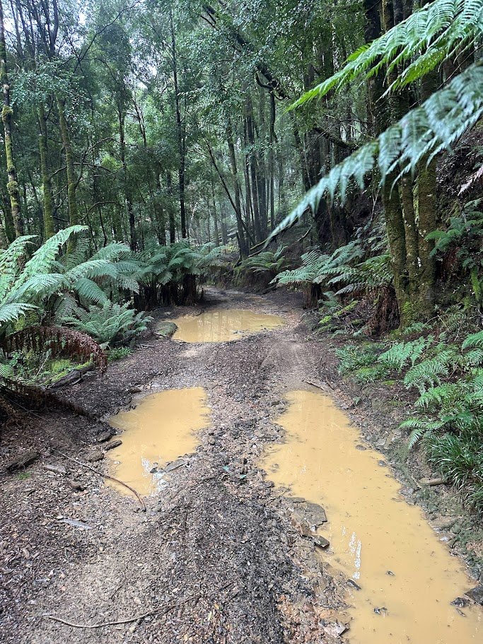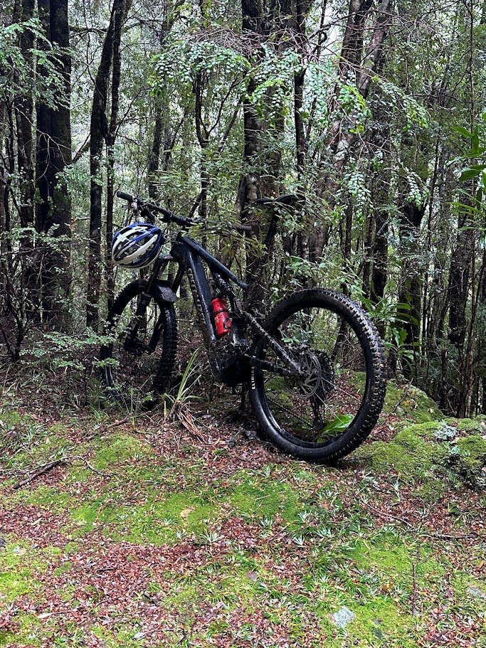 Although the flow was good at Montezuma Falls, that wasn’t really why I was there so after a few quick pictures, I gingerly pushed my bike over the suspension bridge losing my balance a couple of times which was a bit unnerving (I put it down to the extra weight of the e-bike) before continuing on along the now much muddier and wet 4WD access track.