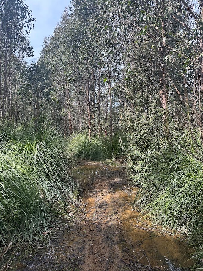The actual track heads off around the forest coupe to your right as you pulled into the area (ie. North). You follow it down and around the forest coupe for about 100 metres before it heads west and around the older logged coupe. It’s a really obvious, but wet and slippery, track and you basically just follow your nose from here around the coupe until you descend down a step section to find some pink tape (on your right) marking the start of a small walking track to the falls (about 800 metres from the car).